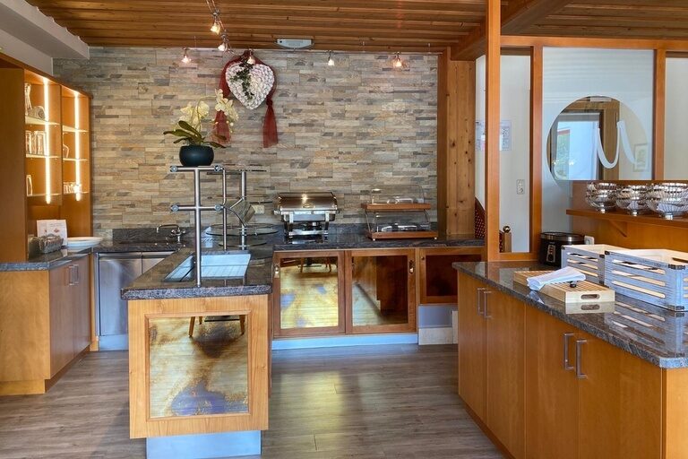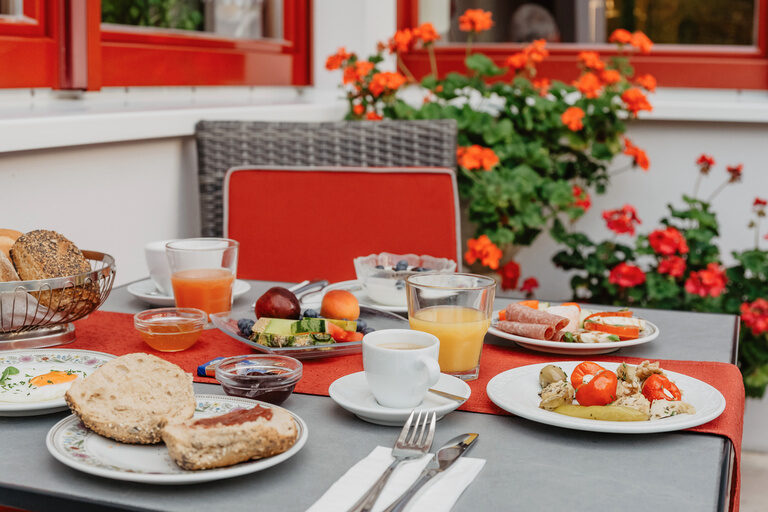 Einen gemütlichen Speiseraum, in dem Sie das Frühstücksbuffet mit regionalen Köstlichkeiten genießen können.